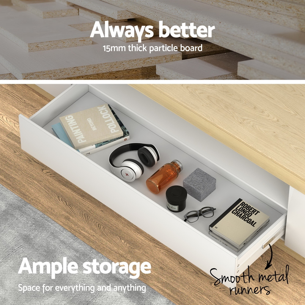 Elevate your home entertainment with the Artiss Lior Entertainment Unit. Featuring a sleek two-tone design, this unit is crafted from 15mm thick particle board with a melamine finish. Enjoy ample storage with an open shelf, two deep cabinets, and a spacious drawer with anti-rust runners. Its timeless design complements any decor, while the smooth surface ensures easy cleaning. Simple assembly with included instructions makes setup a breeze. Perfect for showcasing your entertainment system in style.