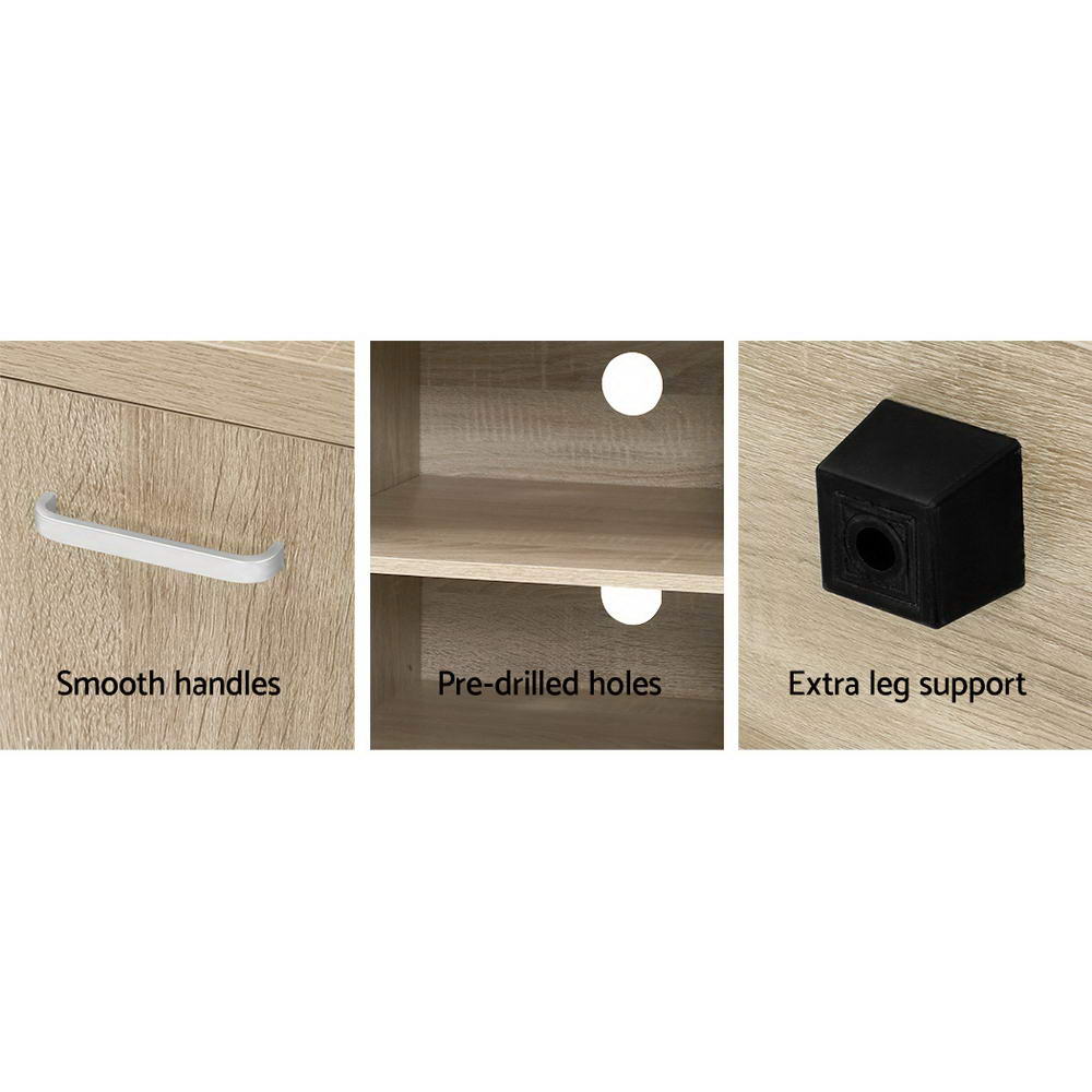 Elevate your home entertainment setup with the Artiss Maxi TV Cabinet. Crafted from durable 30mm honeycomb and 15mm particle boards, this unit boasts a stunning natural woodgrain finish. With ample storage, including two open shelves and deep cabinets with magnetic catches, it's perfect for your essentials. The sleek design features smooth handles and pre-drilled holes for tidy cables. Ideal for any modern Aussie living room, it pairs beautifully with other Maxi series pieces for a cohesive look.