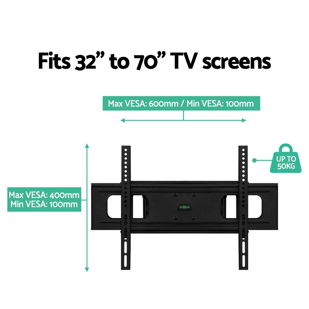 Enhance your entertainment setup with the Artiss TV Wall Mount Bracket, designed for 32"-70" LED LCD TVs. This sleek, black powder-coated iron mount combines robust strength with versatile functionality. Built to support up to 50kg, it offers flexible VESA compatibility and a multi-directional design for the perfect viewing angle, featuring -10° to +10° tilt and 180° swivel. A three-arm extension lets you position your TV precisely, while a safety lock ensures stability. Ideal for concrete or brick walls, this mount is your solution for space-saving, top-notch viewing pleasure.