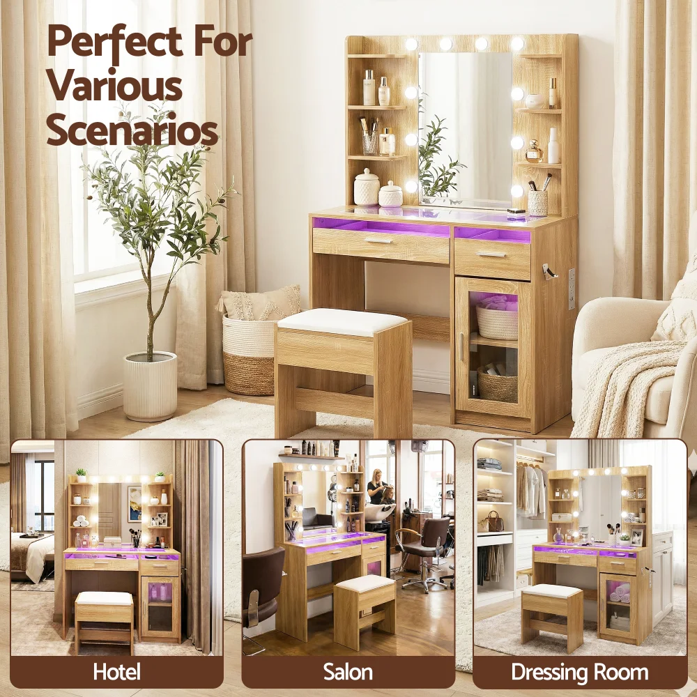 Artiss Dressing Table Vanity Desk Set with 10 LED Bulbs, RGB Light, USB Ports, Stool, Wood Finish, 90x40x142cm