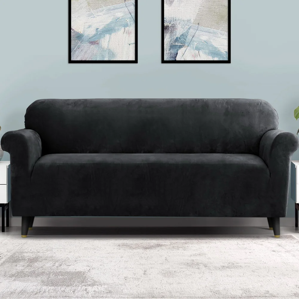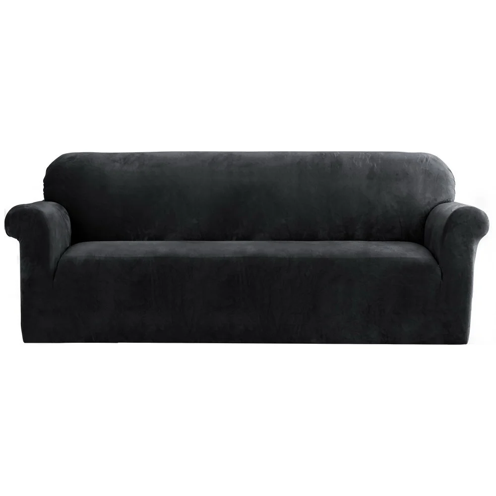 Artiss Velvet Sofa Cover, 3-Seater, Black - Stretchable, Anti-Slip, Machine Washable for All-Around Protection
