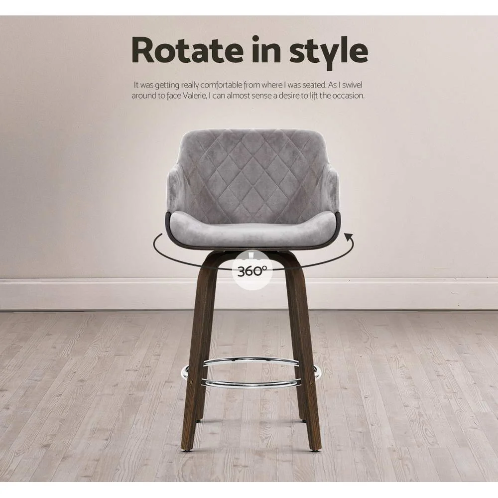 Artiss 2x Bar Stools Swivel Velvet Padded 70cm Bentwood Solid Wood Grey with Chrome Footrest and Contoured Backrest