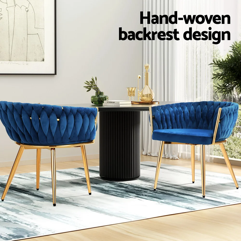 Artiss Set of 2 Velvet Dining Chairs, Hand-Woven Backrest, Armrest, Solid Steel Legs, Blue, 60x50x69cm