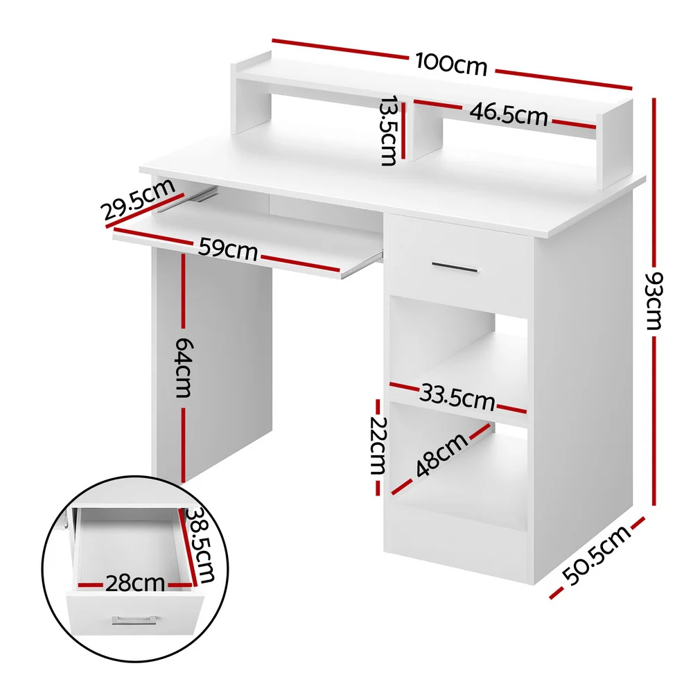 Artiss White 100CM Computer Desk with Storage - E2 Particle Board, Melamine Finish, Shelves, Drawer & Keyboard Tray