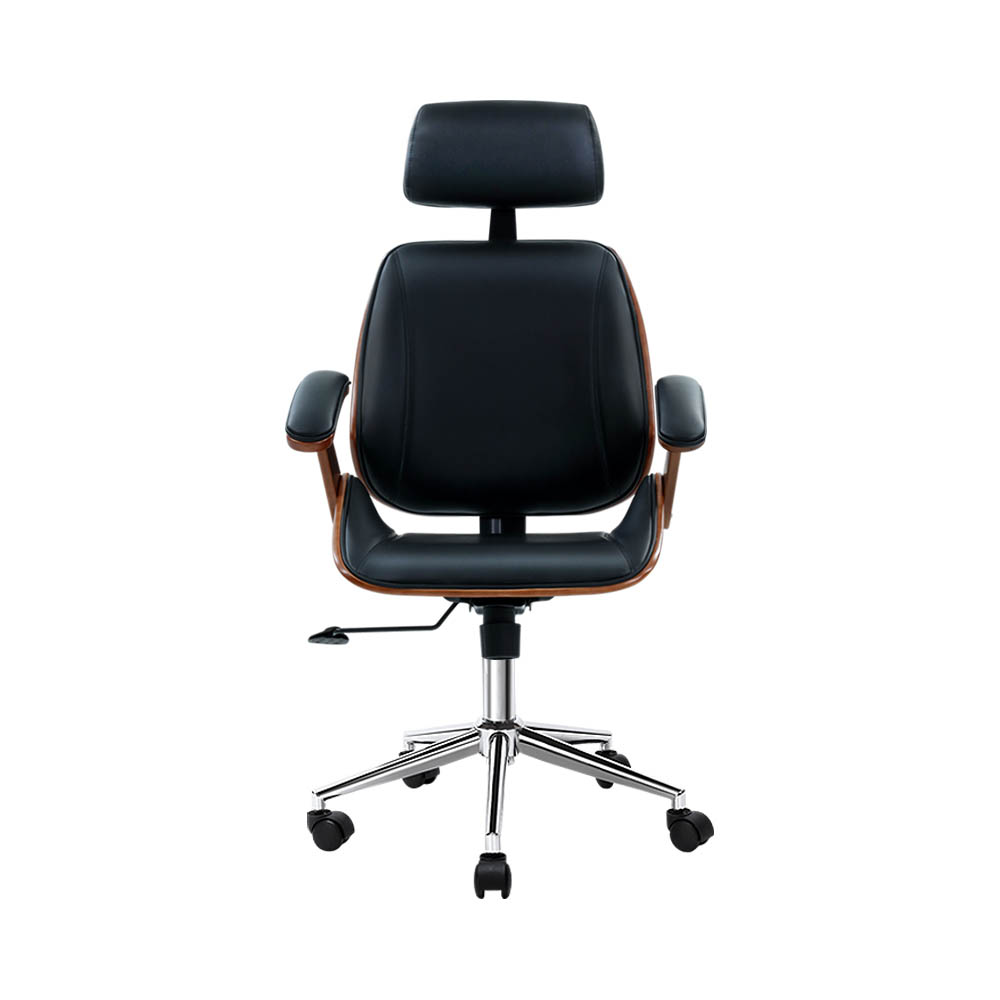 Artiss Wooden Office Chair, PU Leather Seat, Black, Adjustable, 360° Swivel, High Back, Chrome Base, Home Office
