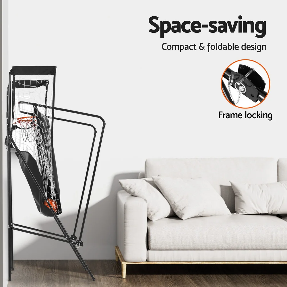 Bring home the excitement of the arcade with this Basketball Arcade Game Electronic Scorer! Featuring a sturdy steel frame, waterproof polyester fabric, and realistic sound effects, this double shoot game is perfect for indoor or outdoor fun. The LED automatic scorer tracks every shot for two players, while the high net and quick ball return keep the action going. The foldable, portable design with Velcro assembly lets you set up and play anywhere. Includes two basketballs for endless competition—game on!