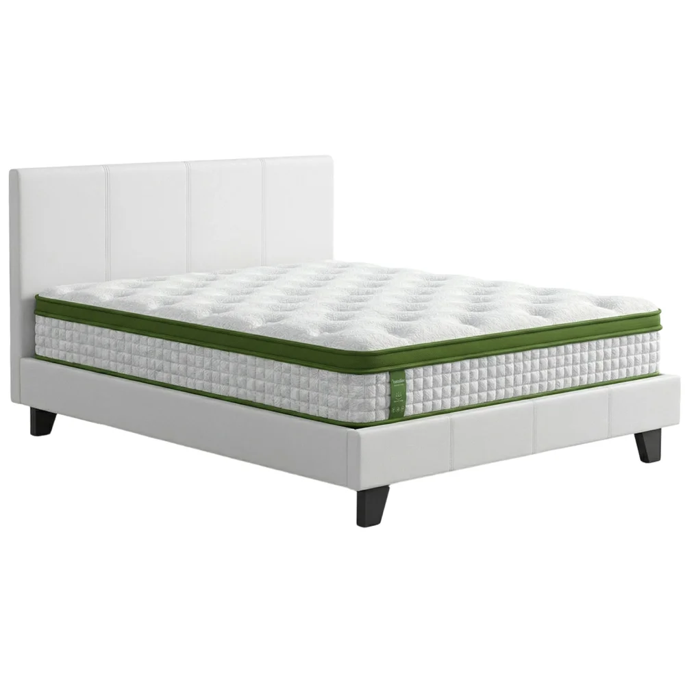 Bedstory Artiss Double Bed Frame in White PVC Leather with Padded Headboard & Hybrid Pocket Coil Mattress, Medium Firm