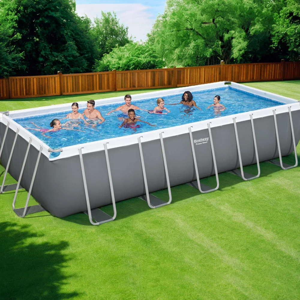 Experience summer fun with the Bestway Power Steel™ Frame Pool, perfect for backyard enjoyment. This 640x274x132cm above-ground pool features a robust, rust-resistant steel frame and UV-protected PVC walls for durability. Enjoy easy maintenance with the included filter pump, ladder, cover, and ChemConnect™ dispenser. Ensure safety with adherence to local pool regulations. Dive into a refreshing escape with a water capacity of 19,281L. Assembly required. One-year warranty included.