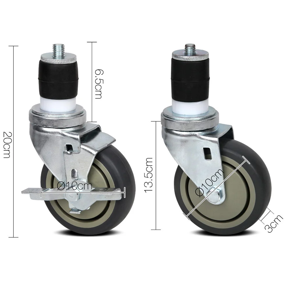 Upgrade your mobility solutions with the Cefito 4" Swivel Castor Wheels, designed for effortless movement and versatile use. This set of four castor wheels is perfect for replacing old wheels or adding mobility to kitchen benches, work benches, carts, and even industrial coffee tables. Each wheel boasts a 200kg weight capacity, with two wheels featuring a convenient side lock brake for stability. Constructed with rubber to protect tile flooring from scratches, these wheels ensure smooth movement thanks to their ball bearing construction. Installation is a breeze, compatible with 35-45mm inner diameter bench legs. Transform your furniture with Cefito's durable and stylish castor wheels today!
