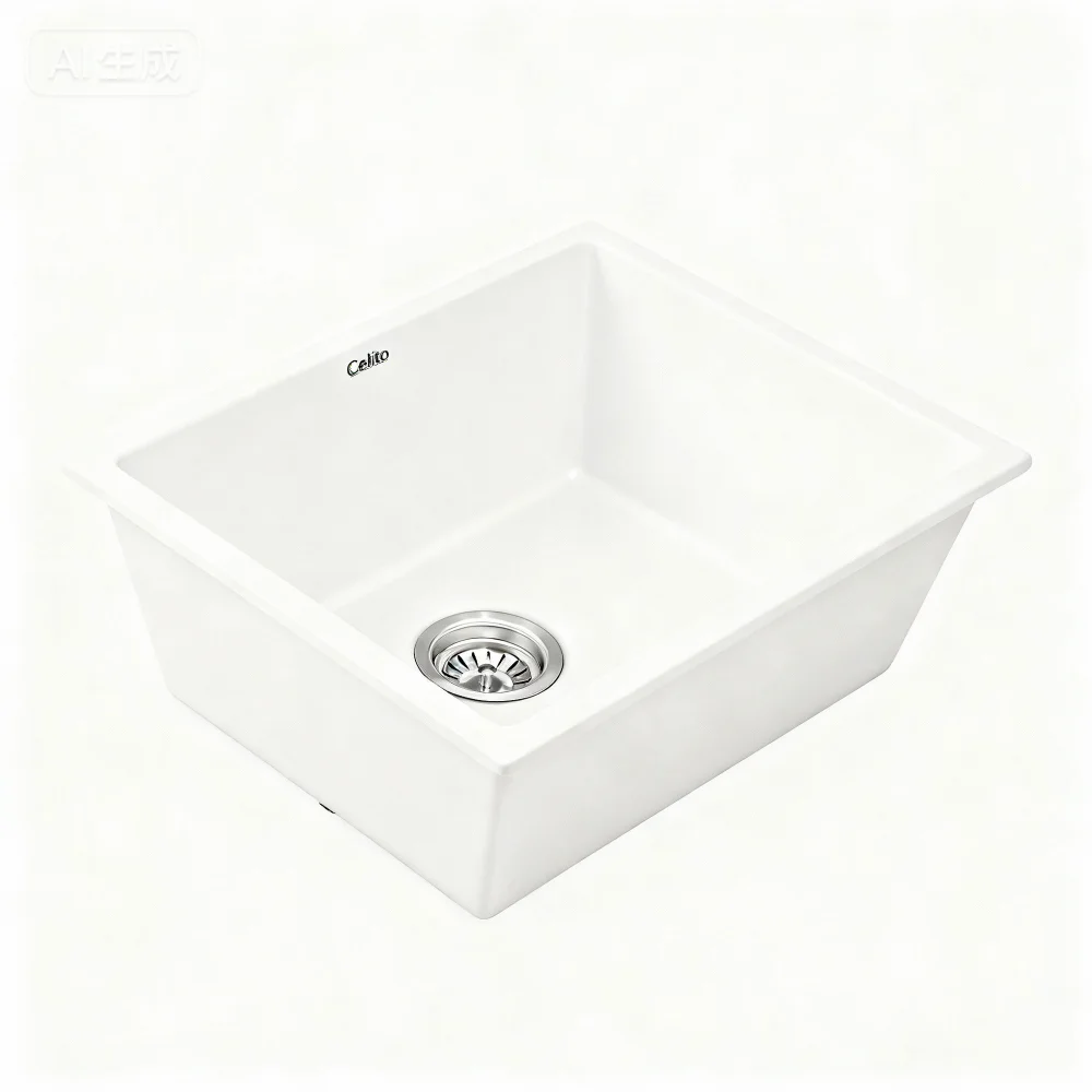 Cefito 38x38cm White Granite Kitchen Sink - Durable Single Bowl, Heat & Scratch Resistant, Easy Clean R15 Corners
