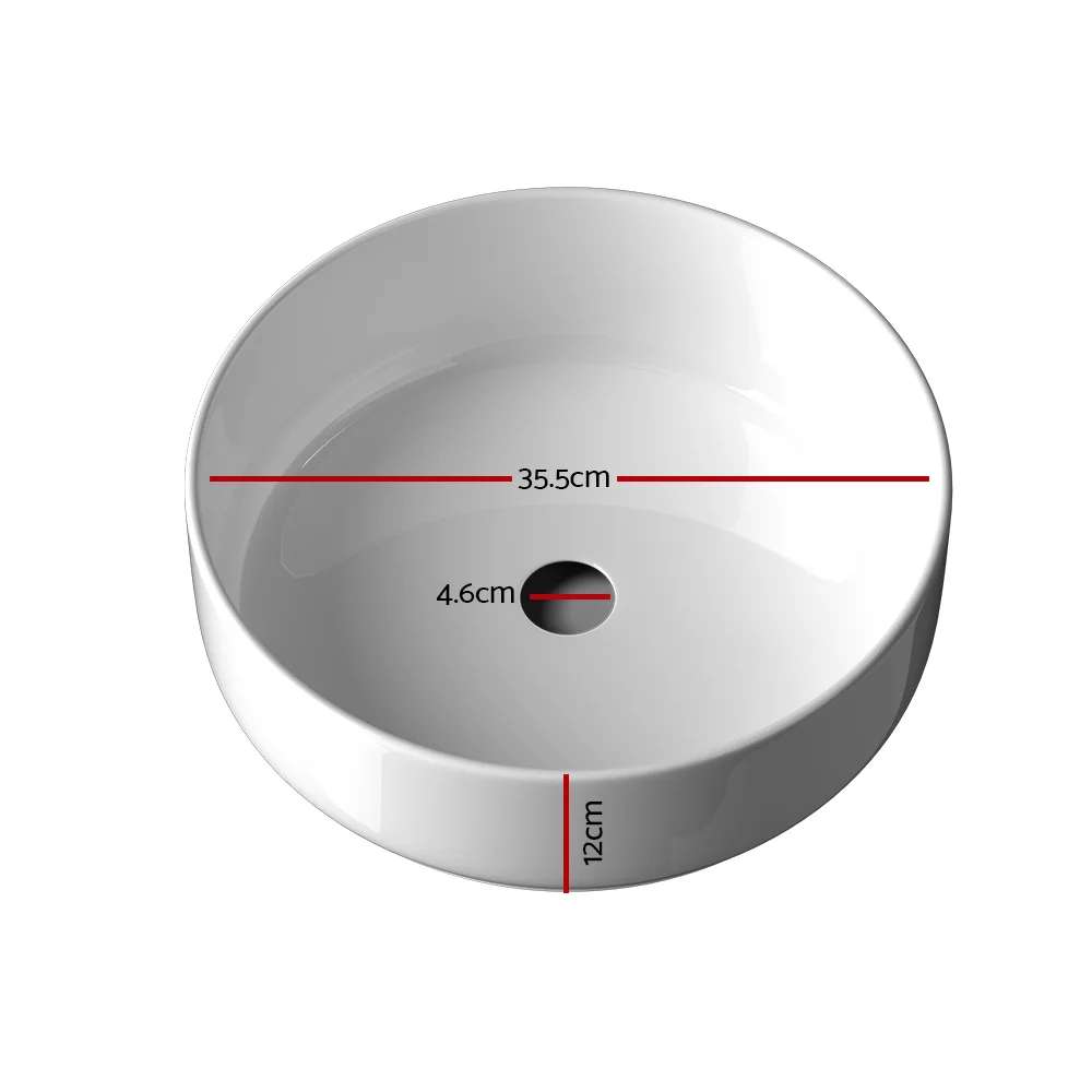 Rejuvenate your bathroom with the Cefito Bathroom Basin Ceramic Vanity Sink. Featuring a sleek, modern design with a high-gloss white finish, this 35x12cm round basin enhances any decor. Crafted from nano-glazed ceramic, it prevents germ build-up and resists scratches, heat, and fading. With smooth, safe edges and a 10-year lifespan, this durable sink is easy to install, making it a stylish, hygienic upgrade for your bathroom. Note: Drain strainer not included.