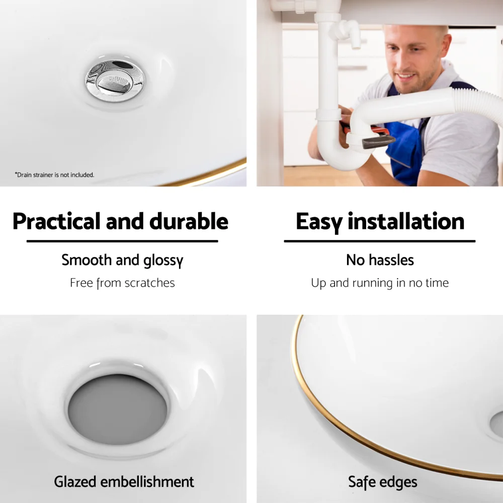 Cefito Bathroom Basin Ceramic Vanity Sink - 41x34cm White with Gold Line, Anti-Scratch, Heat-Resistant, 5-Year Warranty