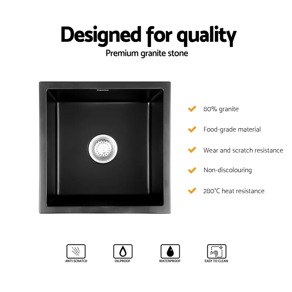 Introducing the Cefito Kitchen Sink 45x45cm Granite Stone Sink Single Bowl in Black—your ultimate kitchen upgrade. Made from an advanced composite material with 80% granite, this sink boasts exceptional durability and impact resistance. Its heat tolerance up to 280°C and scratch-resistant surface make it perfect for everyday use. The non-porous, food-grade material ensures a hygienic prep area, while R10 rounded corners add a modern touch and simplify cleaning. Suitable for under mount, flush mount, and drop-in installations, this versatile sink is a stylish fit for any kitchen design.