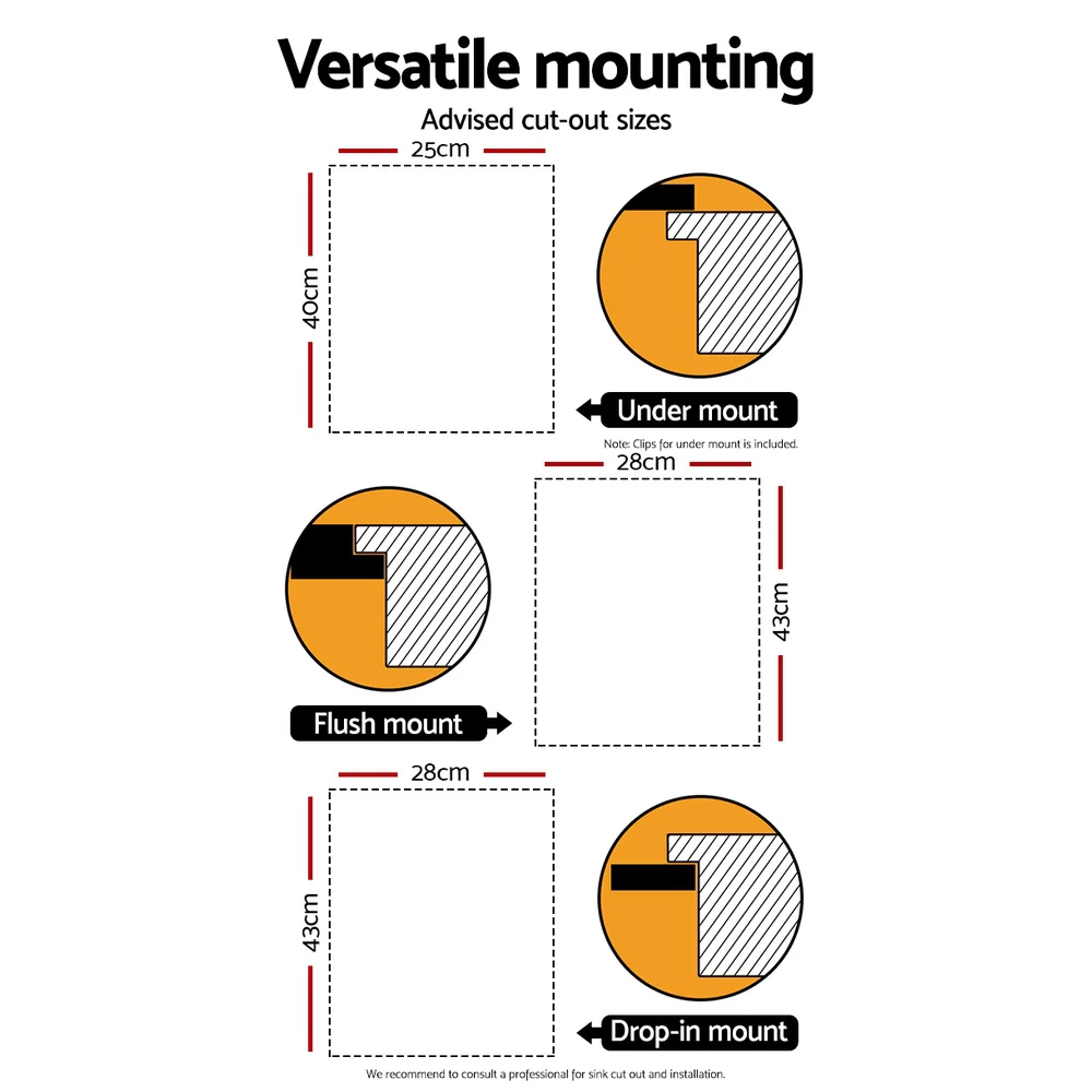 The Cefito Kitchen Sink is a testament to quality and craftsmanship. Made from premium 304 food-grade stainless steel, this 45x30cm sink is scratch-proof, oil-proof, and bacteria-free. Its satin-coated finish adds a touch of elegance, while the X-flume design ensures efficient drainage. The deep, wide bowl features R10 rounded corners for safety and easy cleaning. Eco-friendly anti-condensation paint and five sound-deadening pads enhance its functionality. Perfect for any kitchen installation: drop-in, flush-mount, or under-mount.