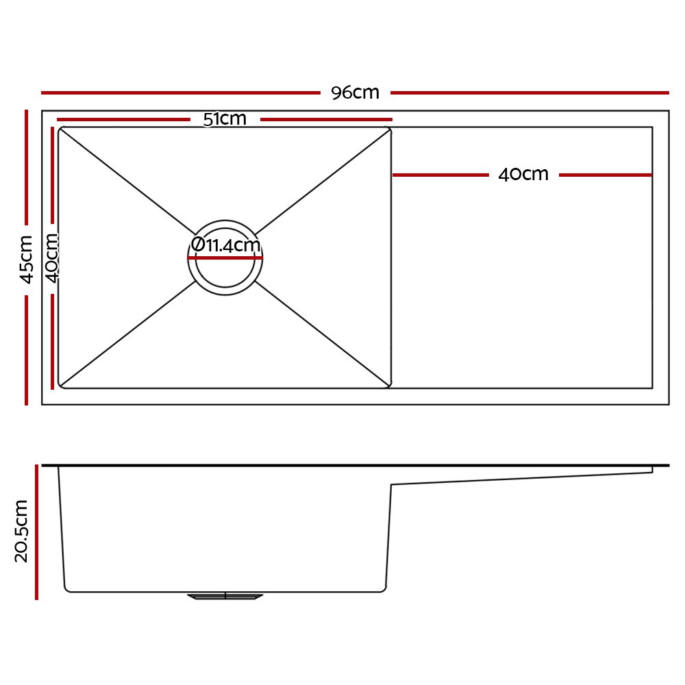 Cefito 96x45CM Stainless Steel Kitchen Sink - Single Bowl, Satin Finish, Scratch-Proof, Sound-Deadening, X-Flume Design