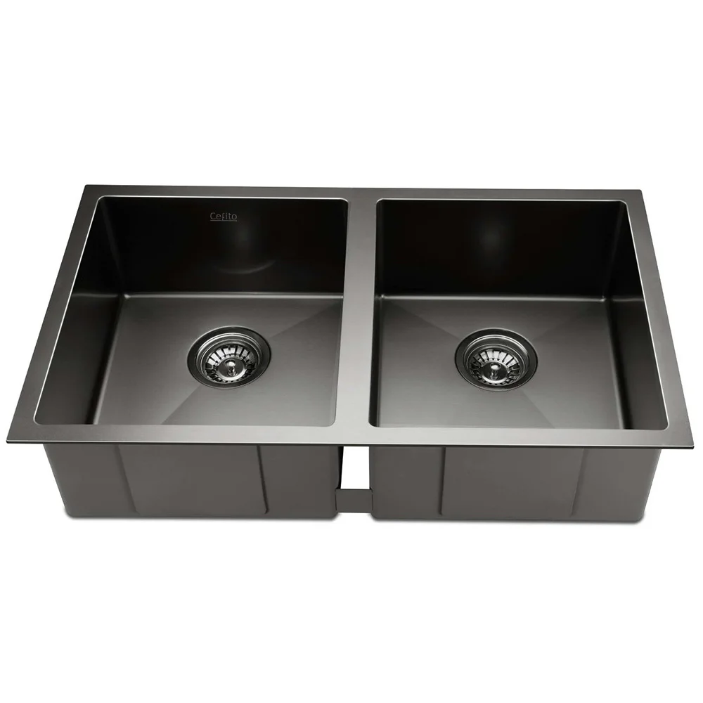 Cefito Kitchen Sink, Stainless Steel Double Bowl, 77x45cm, Black, Scratch-Proof, Anti-Bacterial, Easy Drainage