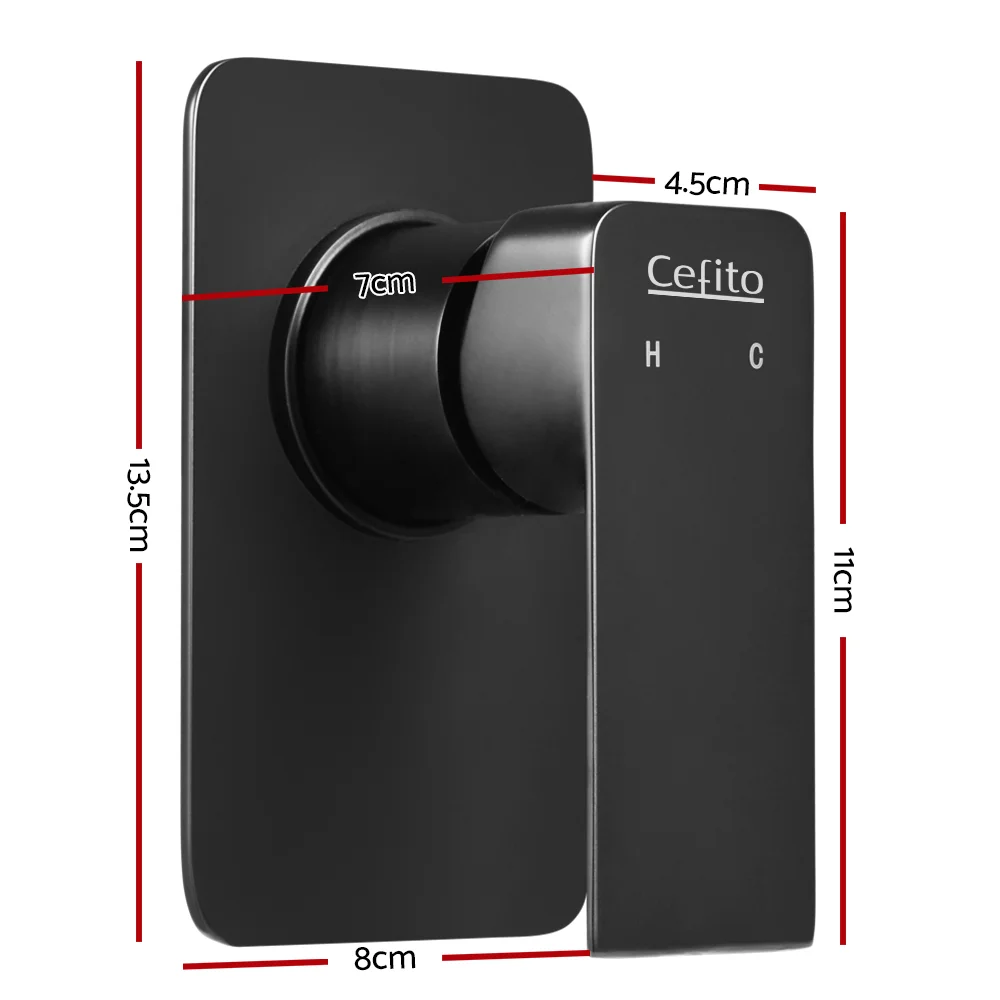 Experience the perfect blend of style and functionality with the Cefito Shower Mixer Tap. Crafted from durable solid brass, this mixer ensures smooth operation with a drip-free 35mm ceramic cartridge that prevents leaks. Its stunning matte black finish is achieved through a meticulous multi-layer process, offering both elegance and durability. Enjoy hassle-free use with clear hot and cold markings, and rest assured with WaterMark certification, meeting Australian standard AS/NZS 3718 for reliable installation.