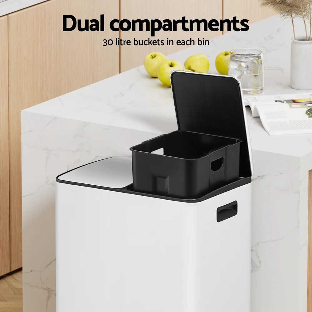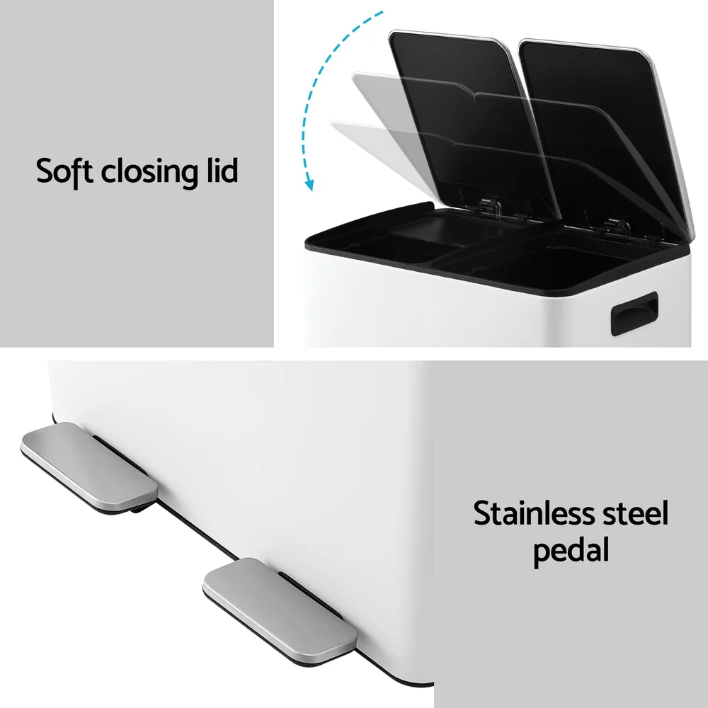 Cefito 60L Dual Compartment Pedal Bin White, Carbon Steel Rubbish & Recycling Dustbin, Soft Close, Waterproof