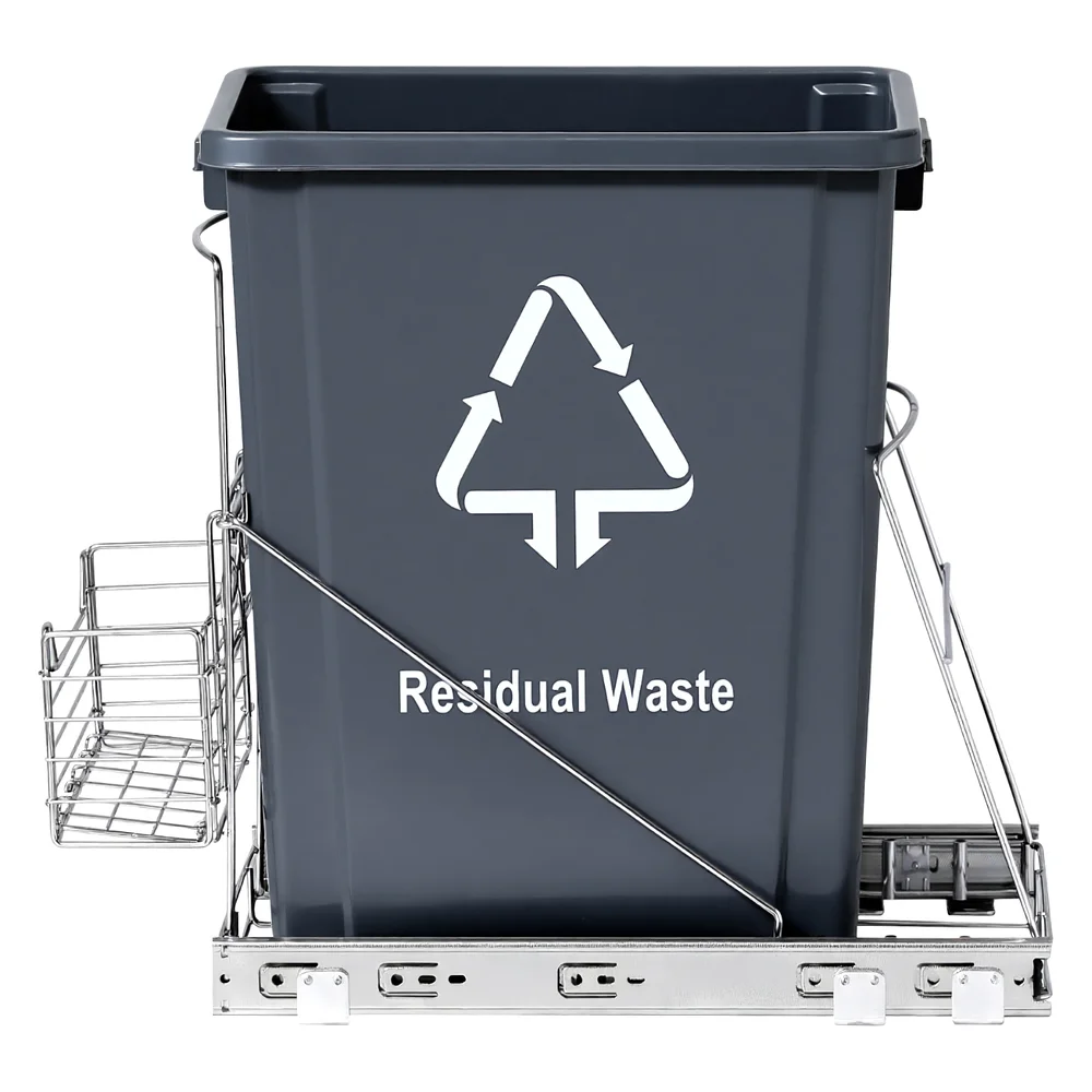 Upgrade your kitchen with the Cefito Pull Out Bin Kitchen Cabinet Slide Garbage Rubbish Bins Basket 40L in Grey. This sleek and practical system maximises space by tucking waste bins out of sight, keeping your kitchen clean and odour-free. The heavy-duty chrome-plated iron frame ensures durability and smooth sliding action, while the large 40L removable bins and front basket provide ample storage for rubbish, recyclables, or garbage bags. Easy to install and clean, this pull-out bin is perfect for optimising narrow cabinet spaces.