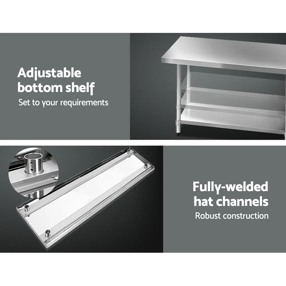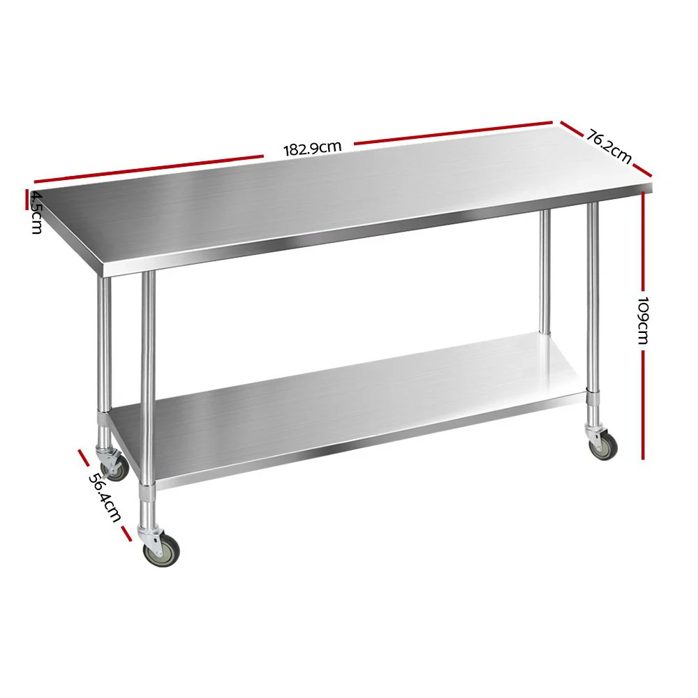 Cefito 1829x760mm Stainless Steel Kitchen Bench with Wheels - Heavy Duty, Adjustable Shelves, Easy Assembly, 430 Grade