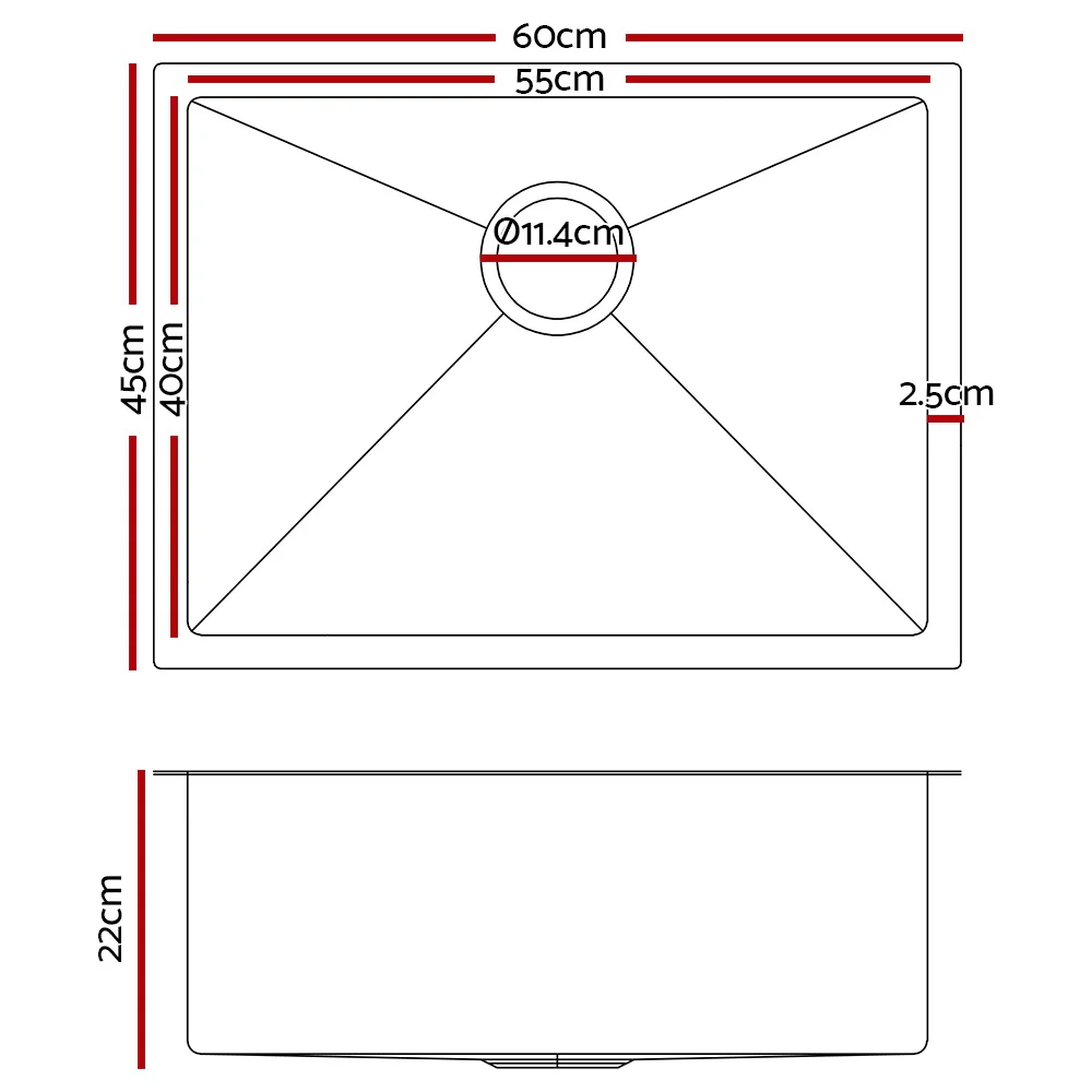 Cefito 60x45cm Stainless Steel Kitchen Sink - Handmade 304 Grade, Satin Finish, Single Bowl, Sound-Reducing Pads