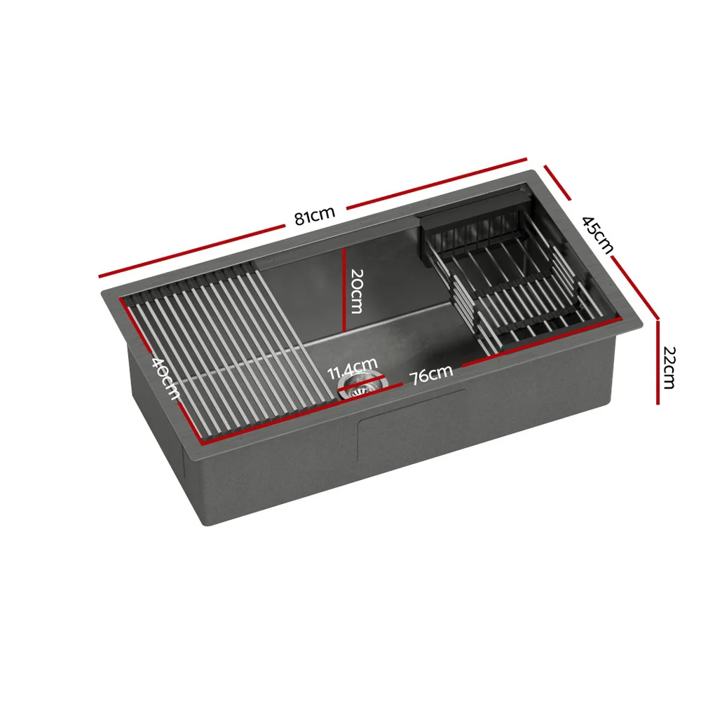 Upgrade your kitchen with the Cefito Kitchen Sink, an 81x45cm masterpiece crafted from premium 304 stainless steel. Its handmade construction ensures durability and elegance, featuring a sleek satin finish, X-flume design for efficient drainage, and R10 rounded corners for effortless cleaning. Complete with a drying rack, basket, and waste strainer, this sink offers versatile installation options and comes with a 5-year warranty, promising both style and practicality.