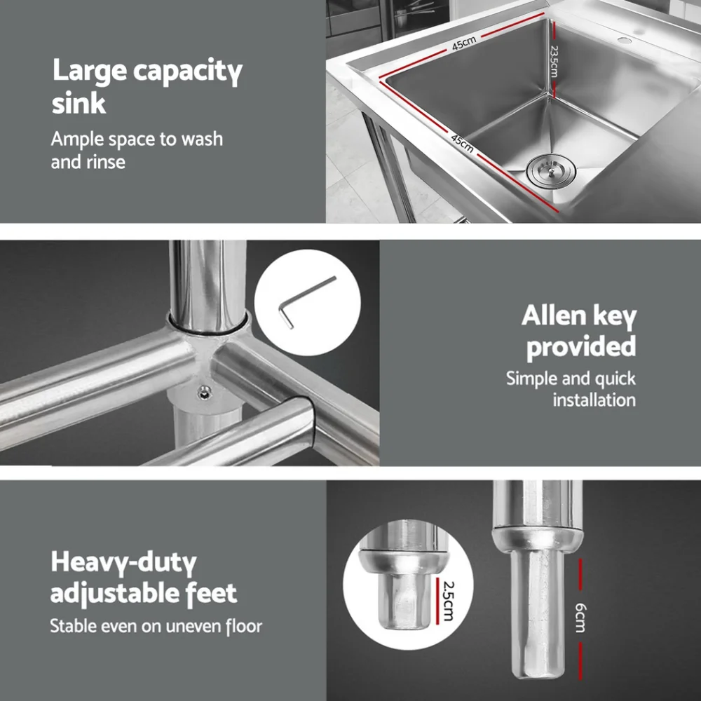 Enhance your kitchen's versatility with the Cefito Stainless Steel Sink Bench. Crafted from durable 304-grade stainless steel, this bench features an adjustable shelf and feet, providing customised storage and workspace solutions. Equipped with lockable castor wheels, it offers effortless mobility and stability. The bench's rust-resistant finish ensures longevity, while the pre-drilled faucet hole and raised edges add functionality. Easy to assemble and move, it's the perfect addition to any kitchen.