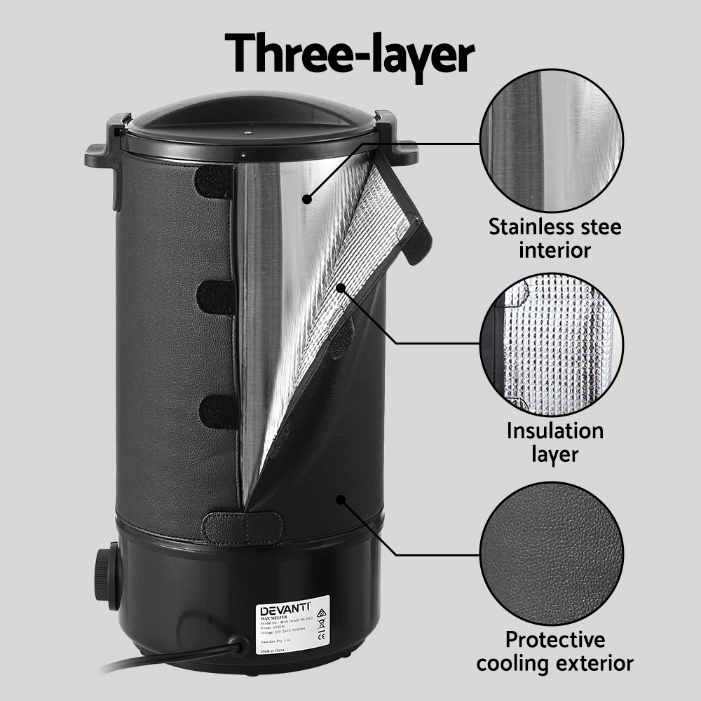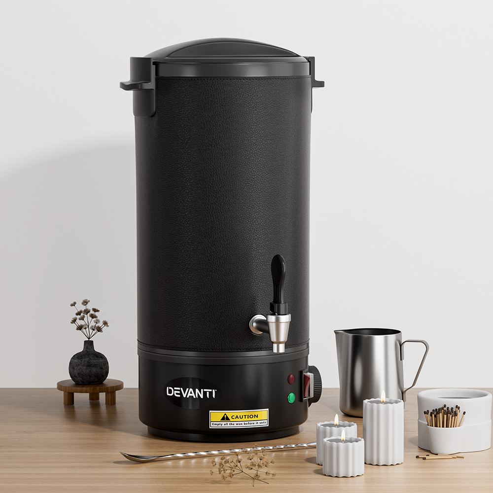 Introducing the Devanti 10L Wax Melter, your ideal partner for candle making and soap crafting. This advanced melting pot combines safety and efficiency with features like thermal safety shutoff and boil-dry protection, ensuring peace of mind during use. Its triple-layer insulation facilitates rapid heating and retains warmth, while the specialised pour spout simplifies wax transfer. Enjoy precise temperature control for a seamless melting experience. Crafted from durable stainless steel, this melter is not only powerful with its 1520W electric heating but also sleek in its black finish.