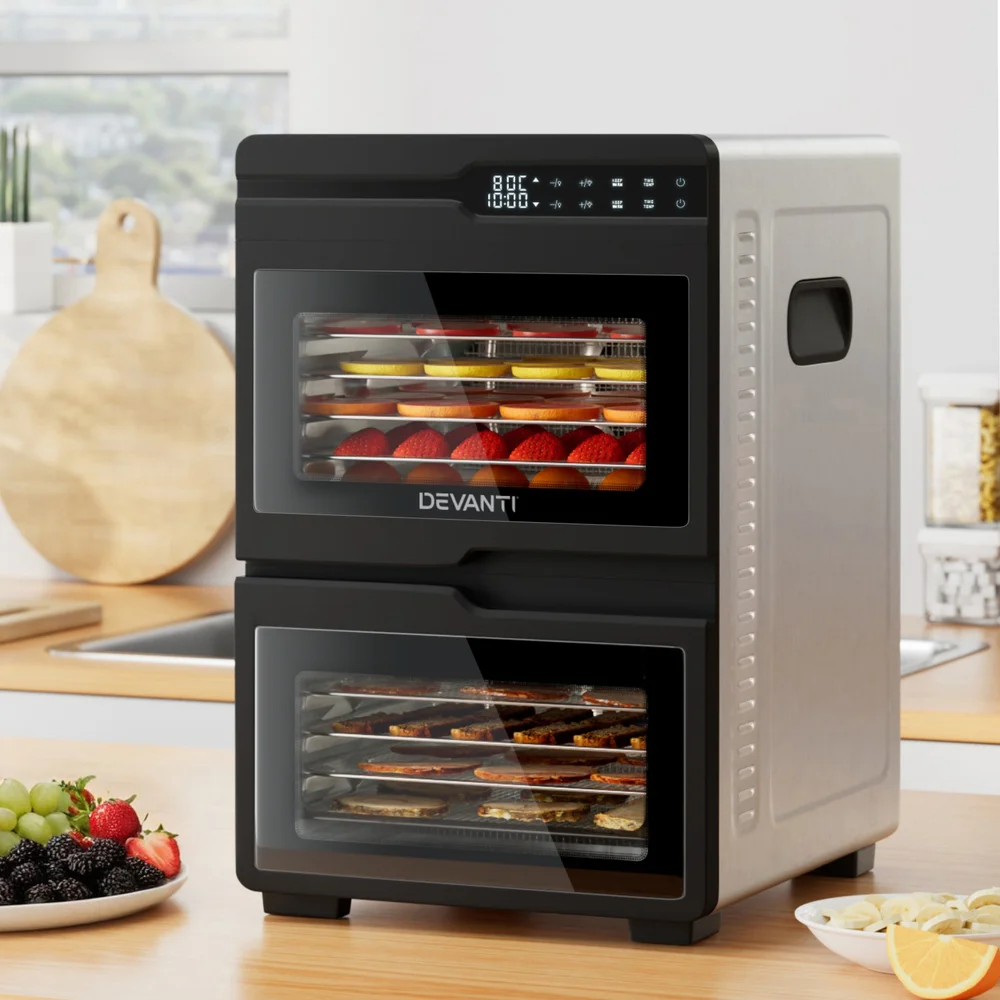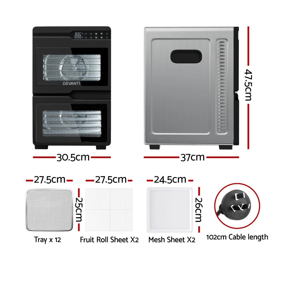 Devanti 12-Tray Dual-Zone Food Dehydrator, Stainless Steel, LCD Control, 35-80°C, 48hr Timer, Includes Fruit Roll Sheets