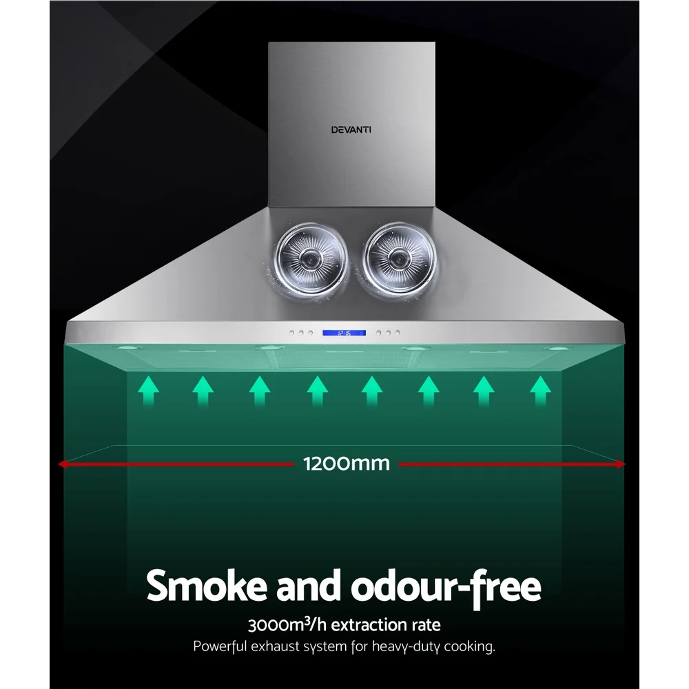 Devanti 1200mm Wall-Mounted BBQ Range Hood, Dual Motor, Black Stainless Steel, Remote & Touch Control, LED Lights