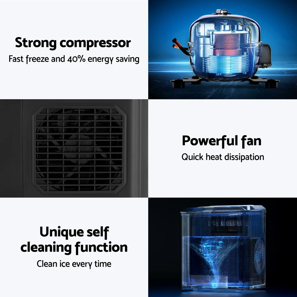 Keep your drinks perfectly chilled with the Devanti 12kg Ice Maker Machine. Compact, portable, and stylish in black, this ice maker produces up to 12kg of bullet-shaped ice daily, with quick cycles of 6–13 minutes for 9 cubes per batch. Choose from small or large cubes to suit any occasion, while the simple control panel, water shortage and ice full alarms, and a transparent viewing window offer effortless operation. Complete with a self-cleaning function, energy-efficient design, and included scoop and basket, it's ideal for kitchens, parties, and picnics. Enjoy convenience and reliability with a 1-year warranty.