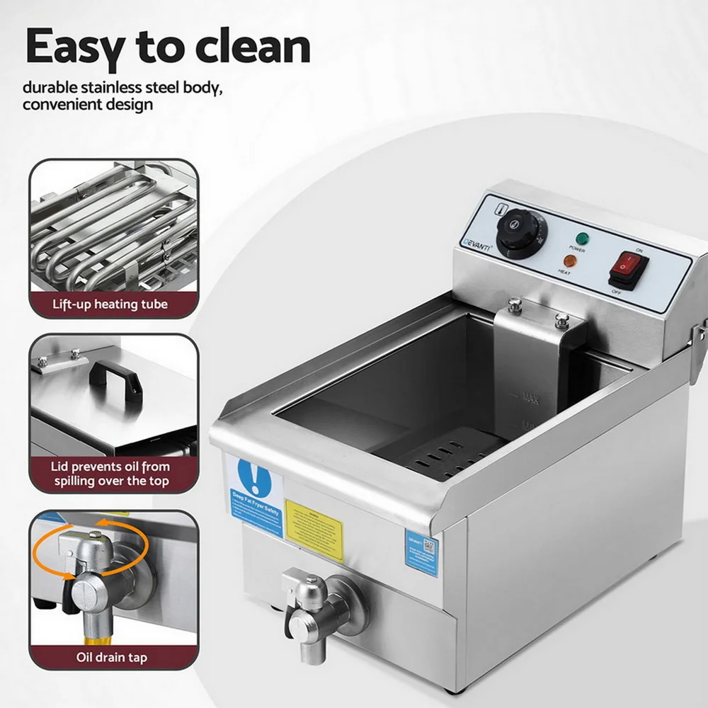 Devanti 3000W Electric Deep Fryer 10L Stainless Steel Commercial Fryer with Basket, Lid & Oil Drain Tap