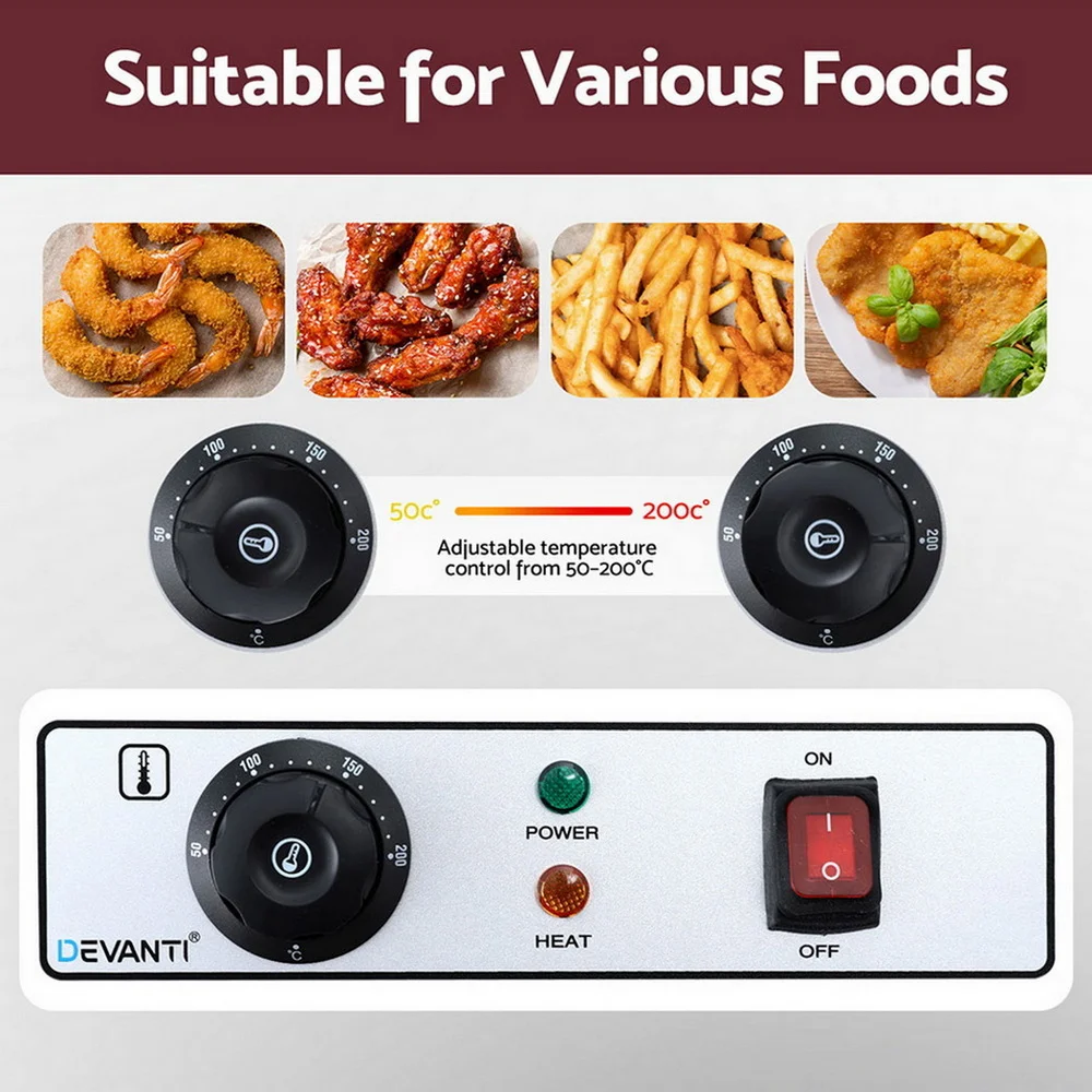 Devanti 20L Stainless Steel Commercial Deep Fryer - Double Baskets, Oil Taps, 6000W, Fast Heat, Safety Features