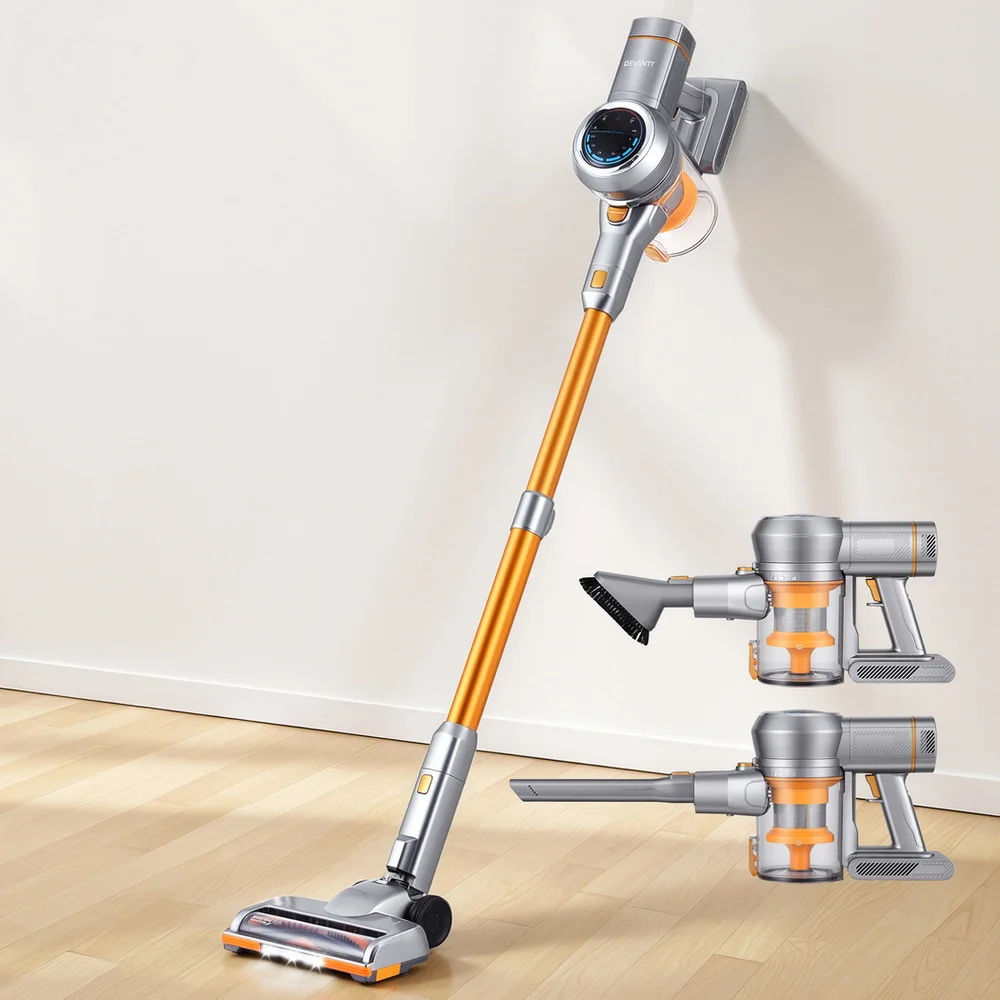 Effortlessly transform your cleaning routine with the Devanti 300W Stick Vacuum Cleaner Cordless Self-Standing Golden. Engineered with an upgraded 300W brushless motor, this lightweight and cordless vacuum offers powerful suction for thorough dirt and debris removal. Its adjustable 3-speed suction and ergonomic design ensure versatility across various surfaces, while the LED display with touch control provides intuitive operation. The swivel vacuum head with LED headlights and an extensible metal tube reaches every corner, and the washable HEPA filter supports eco-friendly maintenance. The 2200mAh Li-ion battery allows quick charging for extended use, and its freestanding design ensures easy storage. Complete with a sofa brush, crevice tool, and wall-mounted holder, this vacuum is the ultimate cleaning companion.