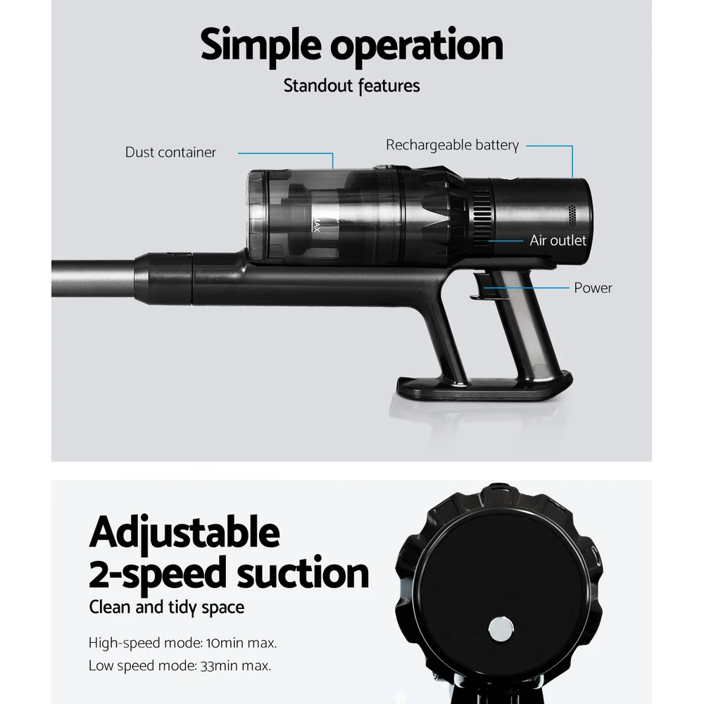 Effortlessly maintain a pristine home with the Devanti Stick Vacuum Cleaner. Boasting a powerful 350W brushless motor, this cordless vacuum delivers high-performance cleaning with adjustable two-speed suction. Its soft roller and swivel head provide gentle yet effective dirt and dust removal on hard floors. The lightweight, portable design ensures easy manoeuvrability while the 2000mAh Li-ion battery offers extended run time. Complete with a washable HEPA filter, wall-mounting holder, and versatile brushes, it's the ultimate cleaning companion.