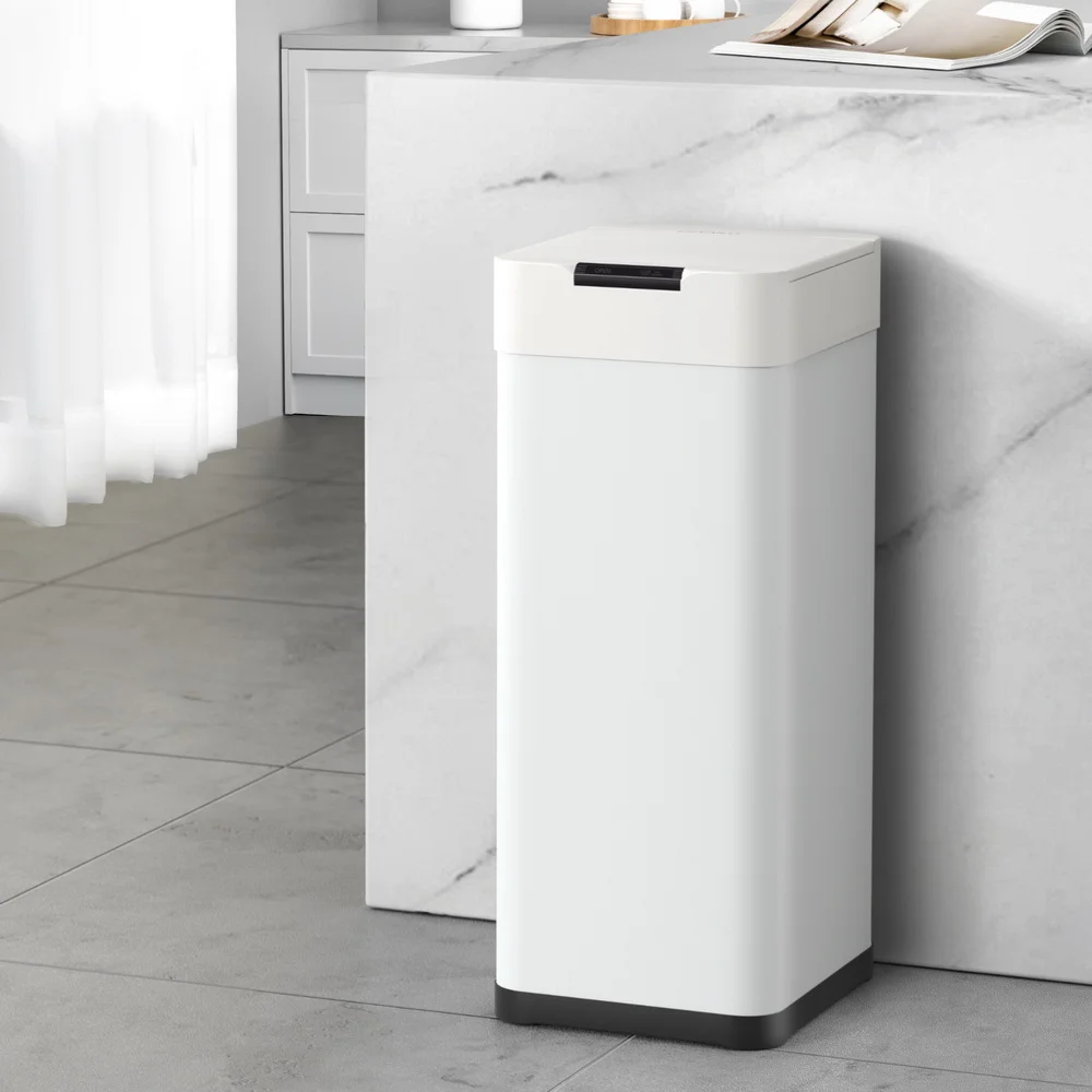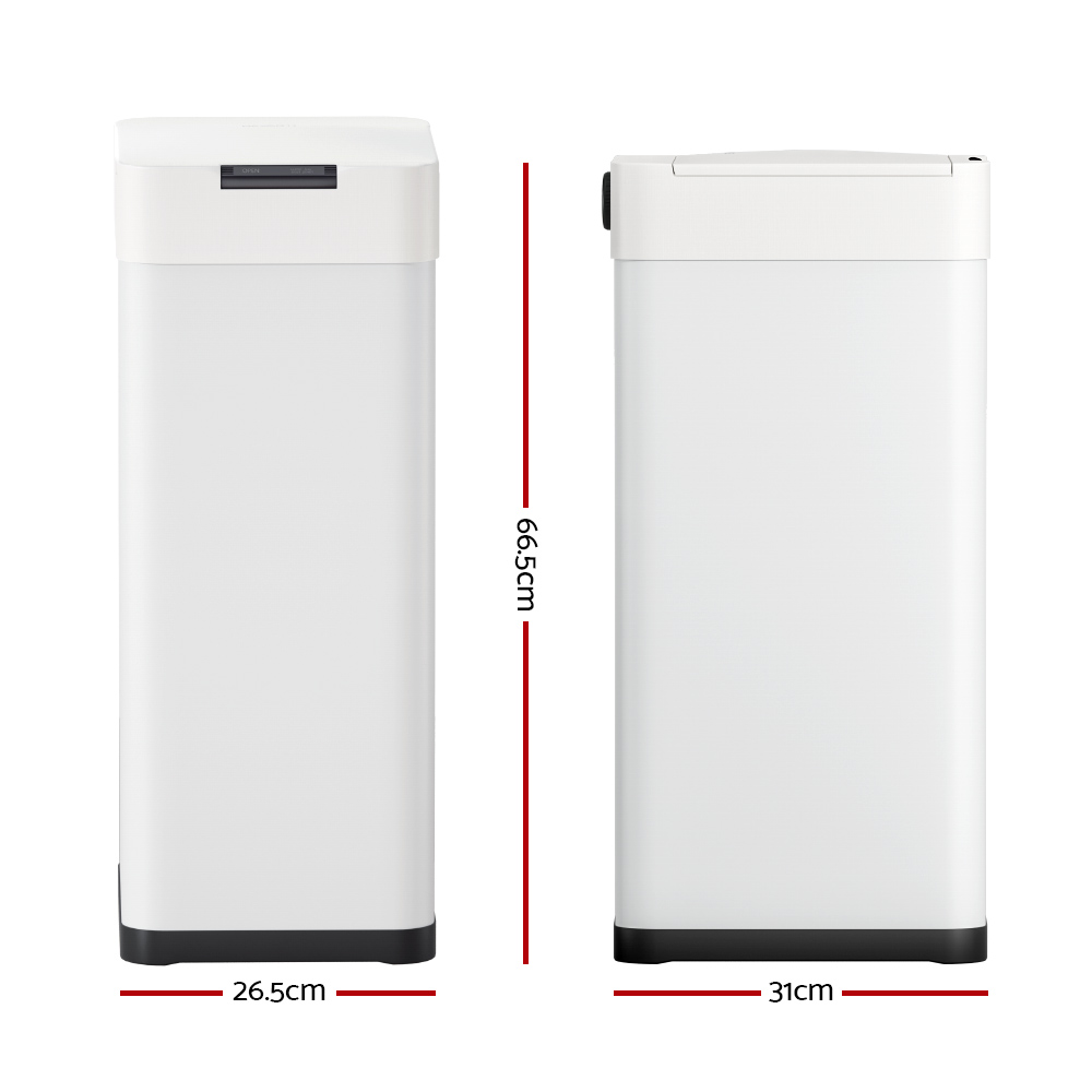 Experience a cleaner, more hygienic home with the Devanti 50L Sensor Bin. This sleek, white automatic trash can features advanced motion-sensor technology, allowing you to dispose of waste effortlessly with a simple wave of your hand within a 20cm range. Its generous 50L capacity minimises the need for frequent emptying, while the fingerprint-resistant iron body keeps your kitchen looking pristine. The convenient bag retaining ring ensures liners stay in place, and the soft-close lid operation is noise-free and odour-sealing. Choose between battery or USB power for versatile operation. Elevate your kitchen hygiene with Devanti.