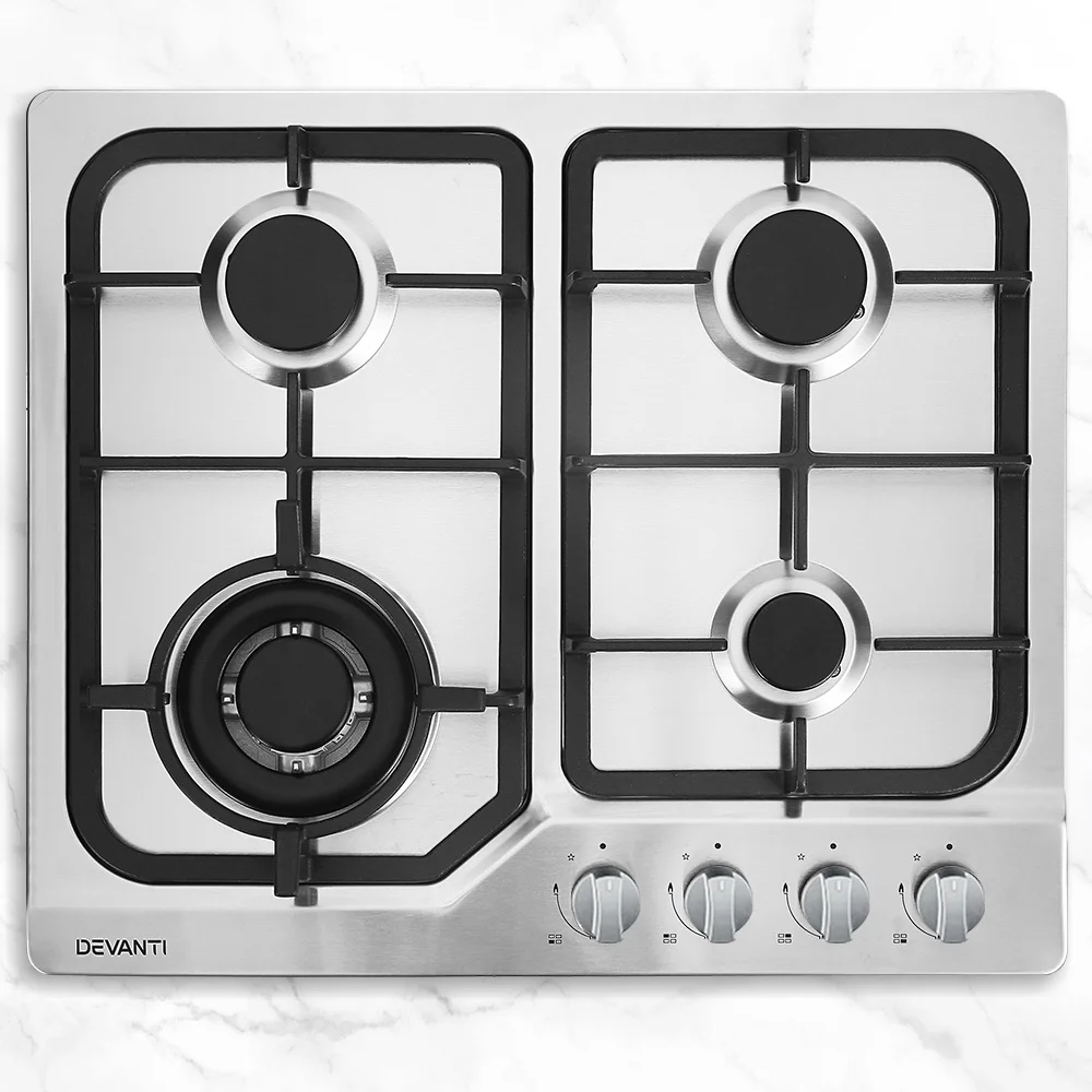 Devanti 60cm Gas Cooktop 4 Burner Stainless Steel, Cast Iron Grates, Wok Burner, Safety Lock, LPG Compatible