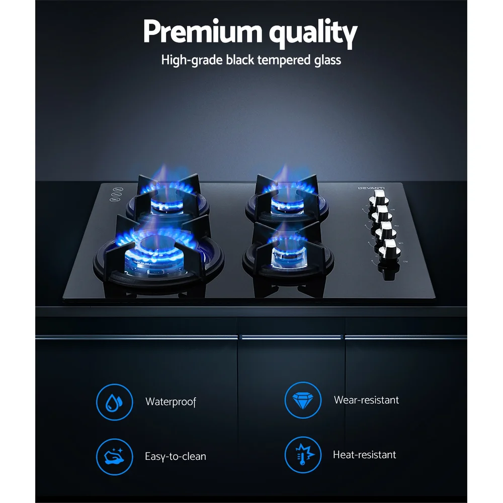 Devanti 60cm Black Tempered Glass Gas Cooktop Stove Hob with 4 Burners, Cast Iron Grates, LPG Conversion Kit Included