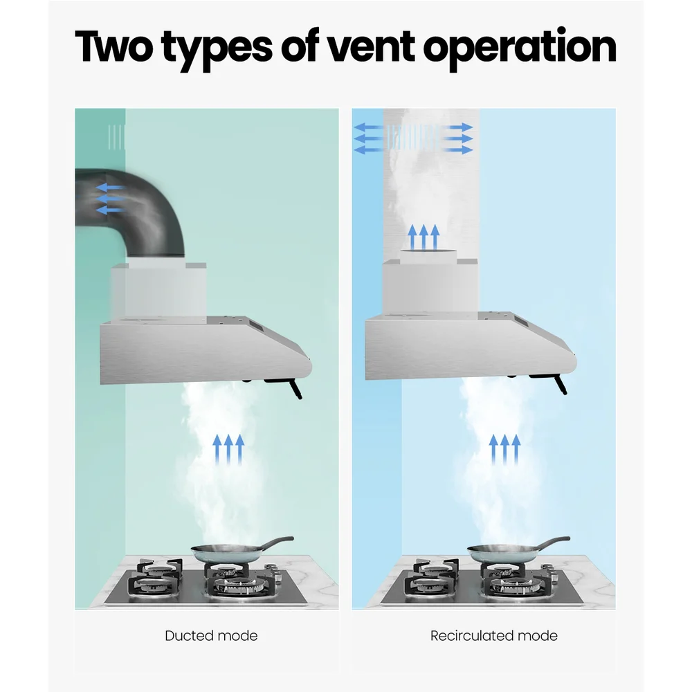Transform your kitchen experience with the Devanti 600mm Range Hood. Crafted from durable stainless steel with a sleek glass visor, this range hood not only enhances your kitchen's aesthetic but also ensures a smoke-free and odour-free environment. With a robust extraction rate of 180m³/hr powered by a high-performance motor, it efficiently clears smoke, steam, and vapours. The 5-layer aluminium grease filter is non-stick and removable for easy cleaning. Enjoy clear visibility with bright LED lights, while the 3-speed fan, controlled by push buttons, allows you to customise airflow. Easy to install, it supports both ducted and recirculated exhaust modes. A must-have for a fresh and clean kitchen atmosphere.
