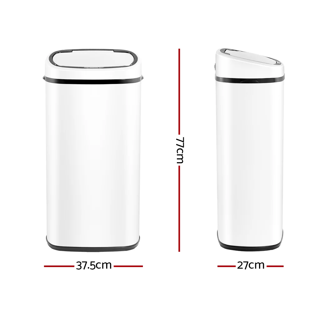 Devanti 50L Motion Sensor Trash Can - White Iron, Hands-Free, Soft Close, USB/Battery Powered, Fingerprint-Resistant