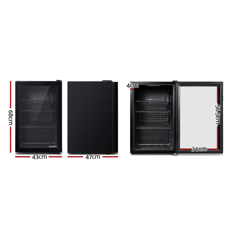 Devanti 78L Black Glass Door Mini Bar Fridge - Compact, Adjustable Shelves, LED Light, Energy Efficient