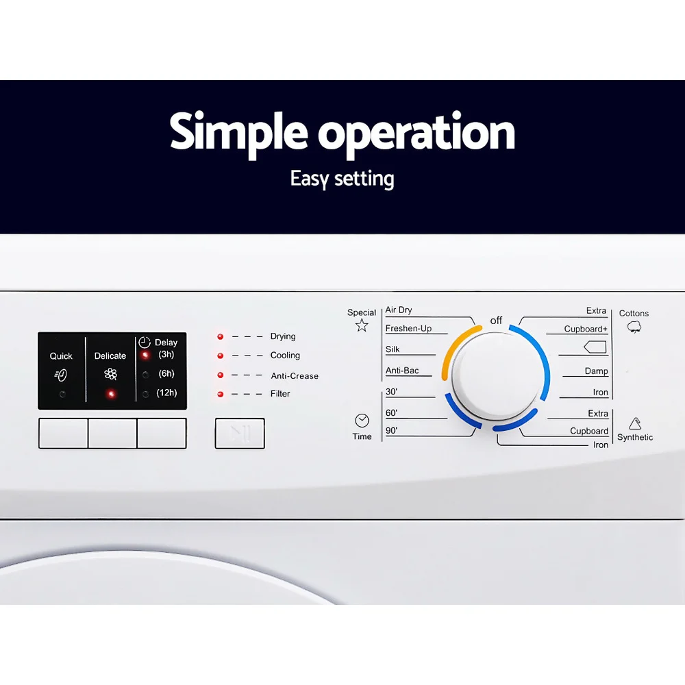 Enjoy perfectly dried laundry, whatever the weather, with the Devanti 7kg Vented Tumble Dryer. This fully automatic dryer features an intuitive digital control panel, intelligent humidity sensor, and multiple drying modes including delicates and cool air-dry. Its anti-crease function, 12-hour delay start, and easy-access filter make laundry care effortless, while the durable stainless-steel drum ensures long-lasting performance. Efficient, reliable, and designed for everyday convenience, it's the ideal solution for fresh, dry clothes year-round.