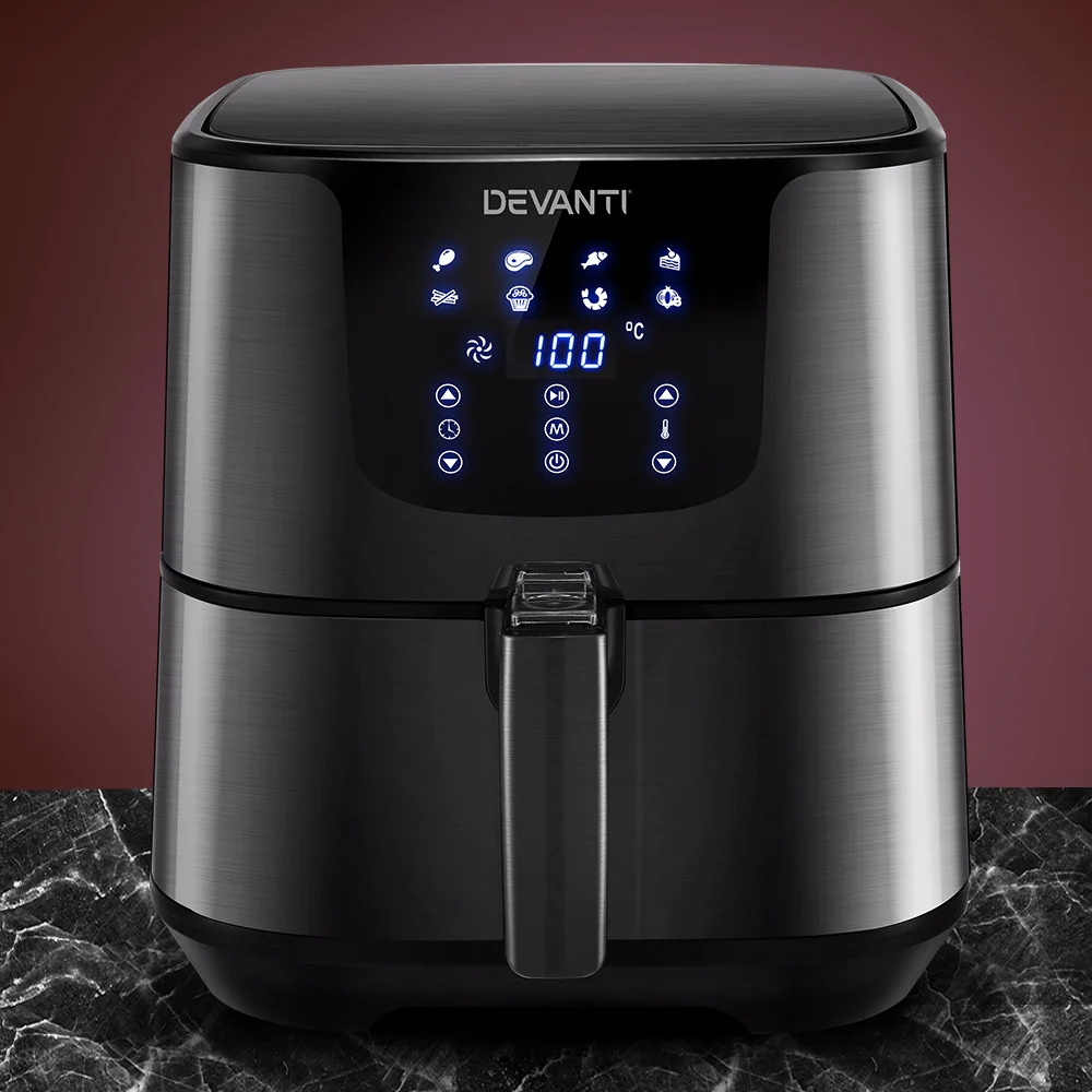Devanti 7L Air Fryer - Black Stainless Steel, LCD Touch Control, Oil-Free Cooking, 8 Presets, 1700W Power