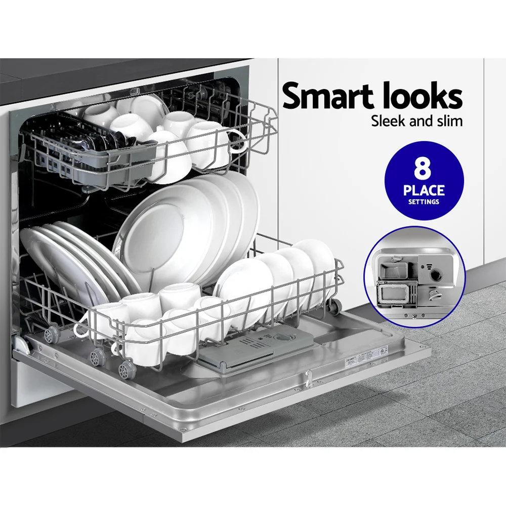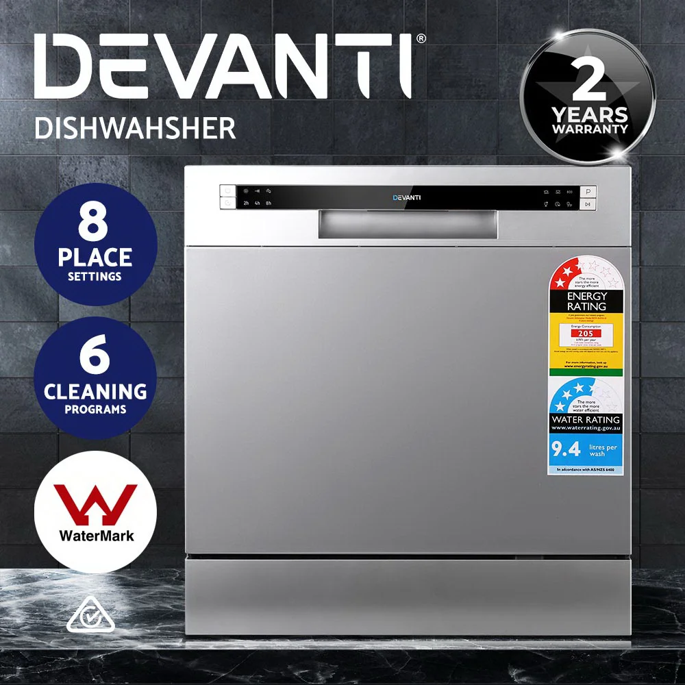 Devanti 8 Place Settings Benchtop Dishwasher, Silver - Compact, Quiet, Stainless Steel with LED Display & 6 Programmes