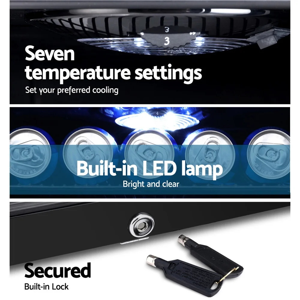 Devanti 198L Black Bar Fridge, Dual Glass Doors, LED Light, Adjustable Temp 2°C-10°C, Energy Efficient, Commercial Use