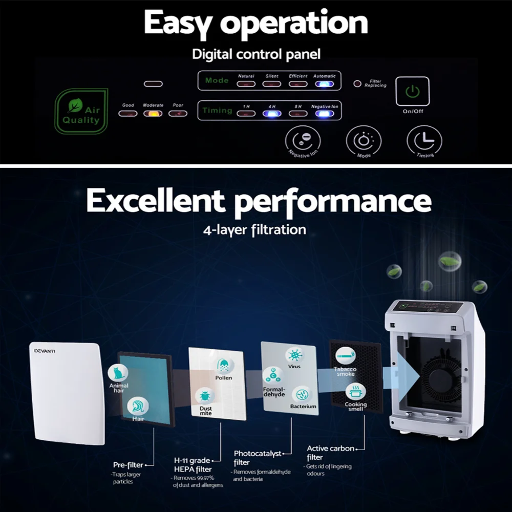 Devanti Air Purifier 4 Stage HEPA H11 Filter, 500m³/h, UV, Anion, PM2.5 Display, Remote, 60m²