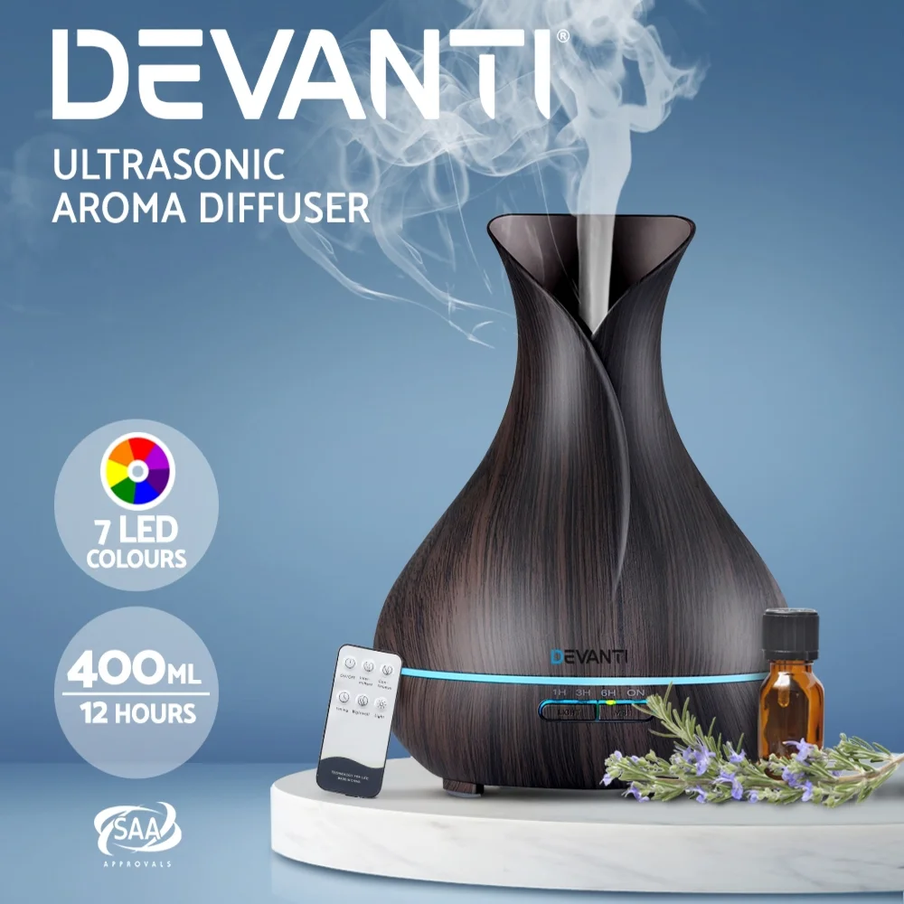 Discover tranquillity with the Devanti Aroma Diffuser Aromatherapy Dark Wood, 400ml. Featuring a light wood grain design and zen-inspired vase shape, this 4-in-1 device works as an aromatherapy diffuser, humidifier, air purifier, and soothing night light. Enjoy whisper-quiet ultrasonic mist, adjustable brightness and mist modes, and 7-colour LED lighting. With a spacious 400ml capacity, remote control, and up to 12 hours of continuous operation, refresh your space and calm your senses effortlessly.
