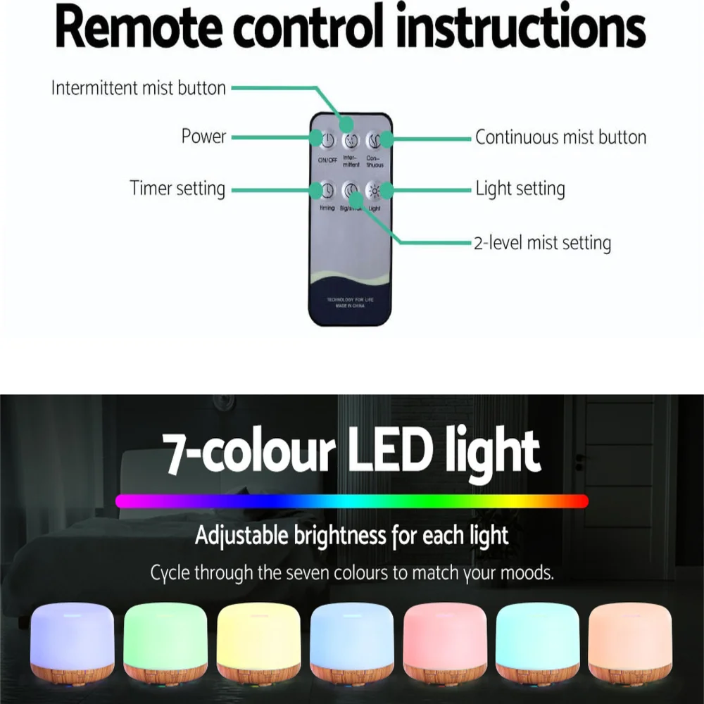 Devanti 500ml Ultrasonic Aroma Diffuser in Light Wood with 7-Colour LED Night Light, Remote Control & Timer Functions