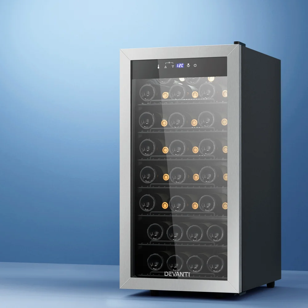 Experience the essence of fine wine with the Devanti Wine Fridge Cooler, designed to store up to 42 bottles with precision and elegance. Its contemporary design pairs seamlessly with any decor, while the advanced 360-degree cooling system, UV-resistant glass, and built-in LED lighting ensure your collection is showcased and preserved at its finest. Whether building a collection or enjoying your favourites, serve them perfectly with Devanti.