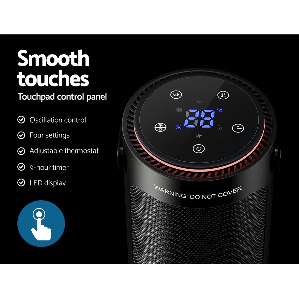 Embrace the warmth of winter with the Devanti Ceramic Tower Heater 2000W. Featuring a rapid PTC heating system and wide-angle oscillation, it ensures even heat distribution. Choose from four modes, including an energy-saving ECO mode. Control your comfort with a top touch panel, nine-hour timer, and remote control. Safety is paramount with anti-scald mesh and tip-over protection. No assembly is required, and it includes a 1-year warranty for peace of mind.